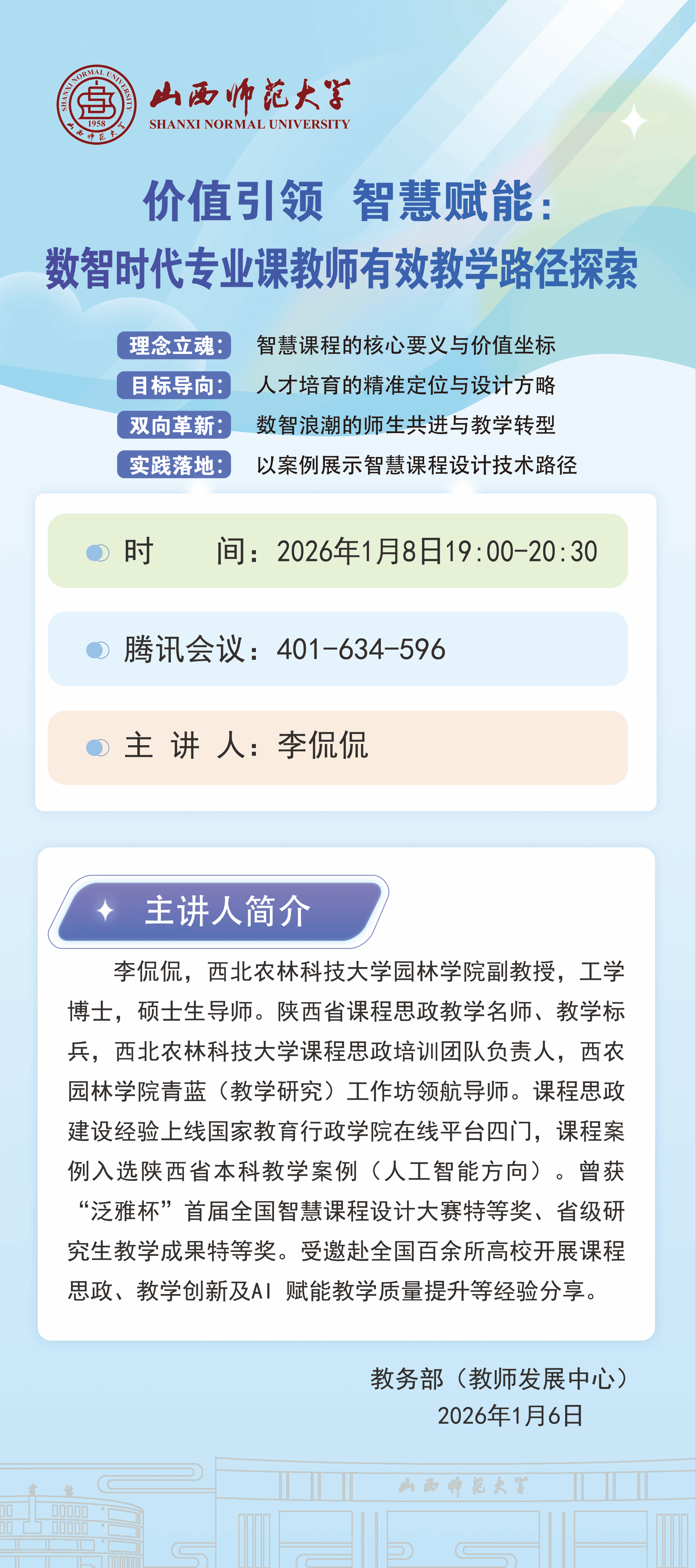 1.教务部邀请西北农林科技大学李侃侃老师在线上进行《价值引领 智慧赋能:数智时代专业课教师有效教学路径探索》讲座,1月8日 晚上19:00 会议号:401-634-596