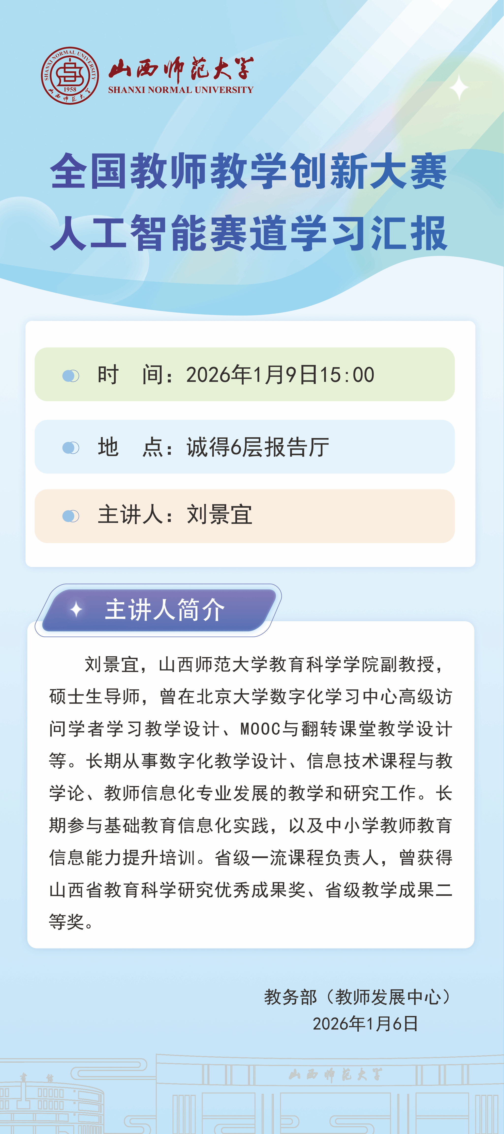 2.教务部邀请我校教育科学学院刘景宜老师进行线下讲座《全国教师教学创新大赛人工智能赛道学习汇报》,时间:1月9日 下午3:00 ,地点:诚得6层报告厅